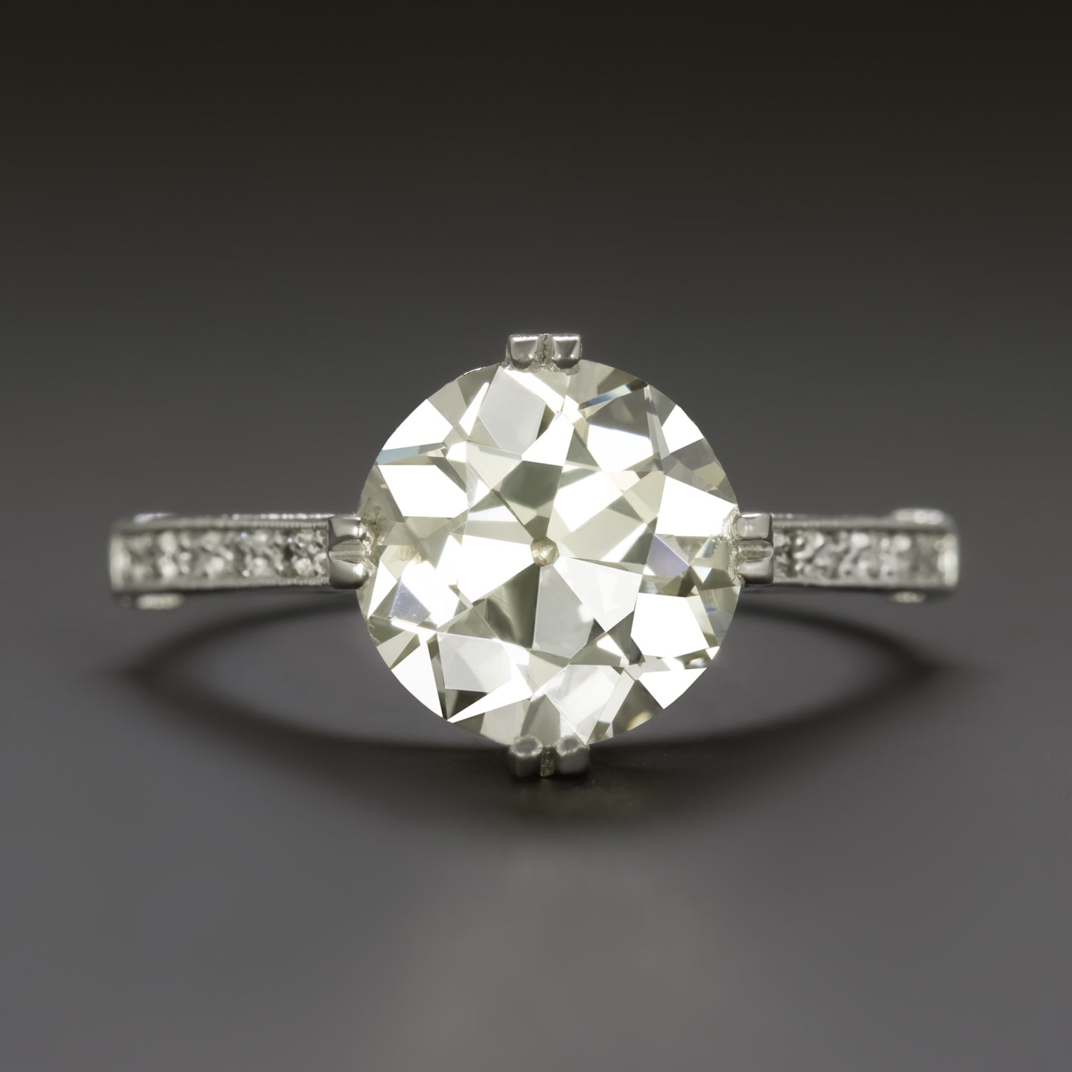 This classic diamond ring features a head turning 2.88ct old European cut diamond set in a sophisticated, diamond accented setting with refined vintage style details.