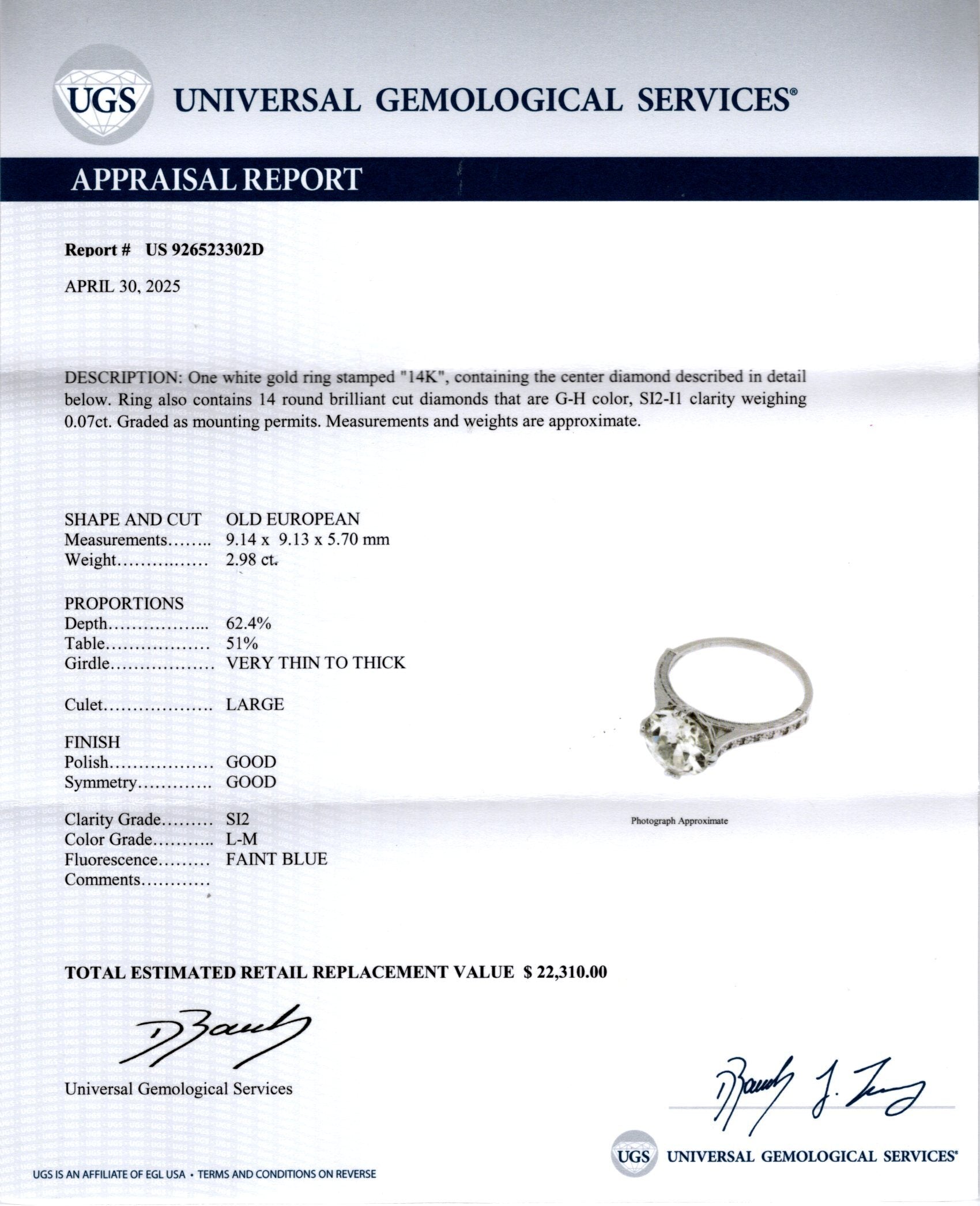 3 CARAT OLD EUROPEAN CUT DIAMOND ENGAGEMENT RING CERTIFIED VINTAGE STYLE 14k