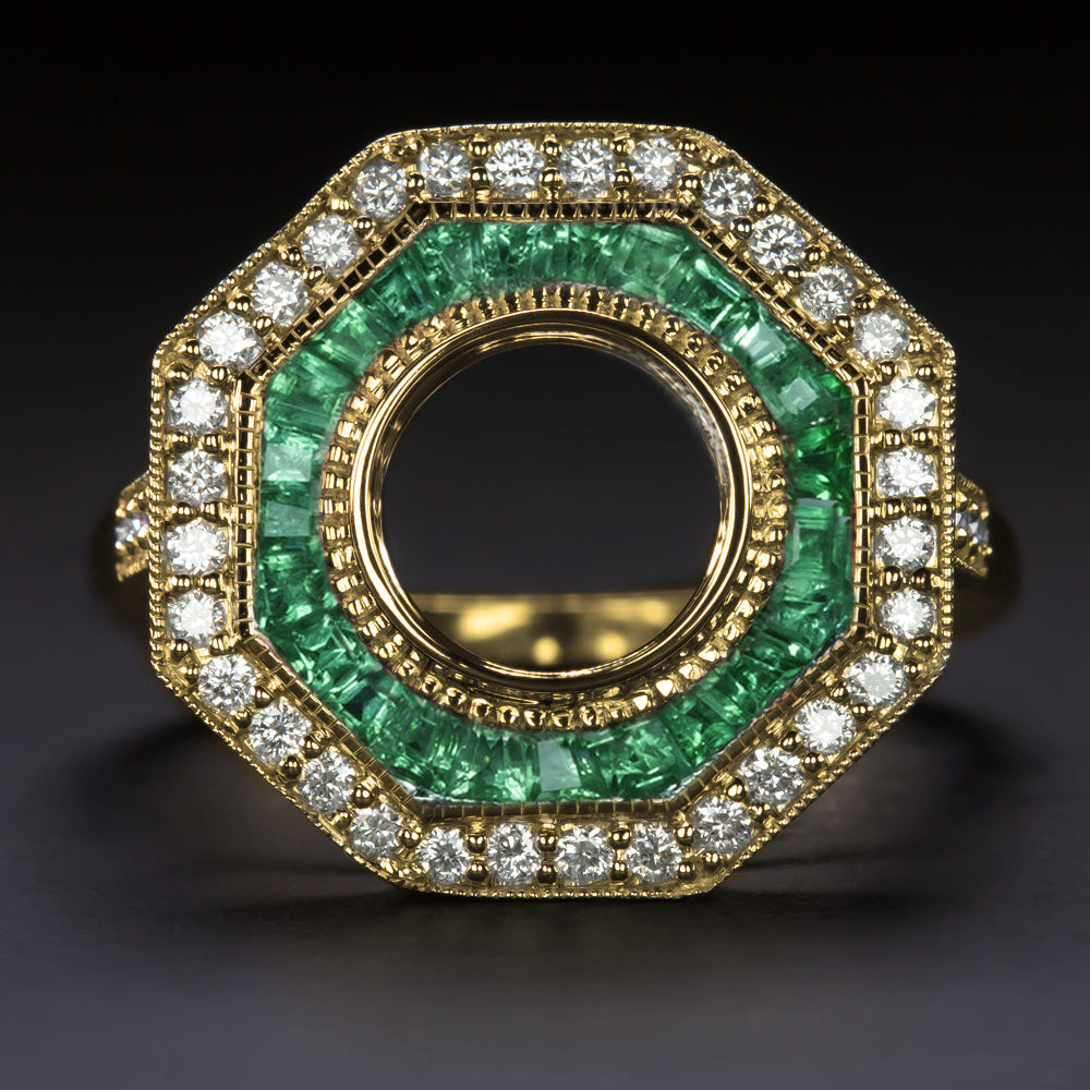 This diamond and emerald semi mount setting has an iconic Art deco design with a octagon shaped double halo of glittering diamonds and spring green custom cut emeralds.