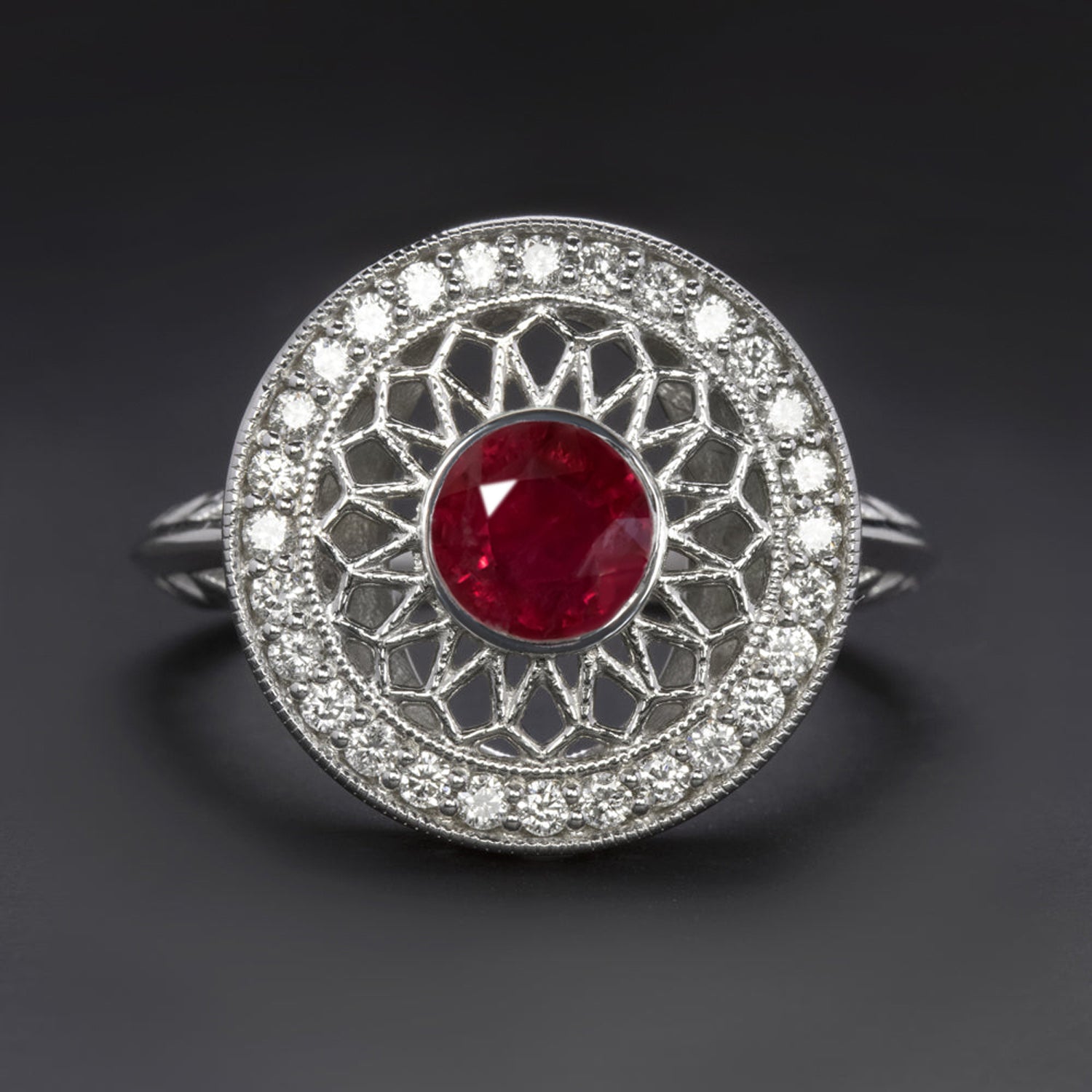 This incredibly detailed diamond ring features a rich red ruby complemented by a richly detailed diamond encrusted setting. The 14k white gold setting is studded with diamonds, elegantly accented with filigree netting, and textured with milgrain!