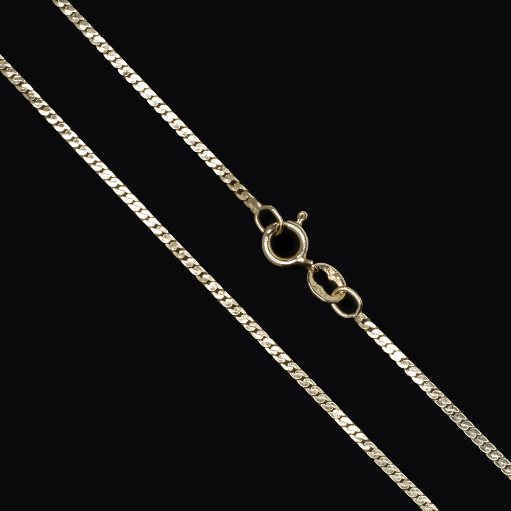 This 14k yellow gold flat S link chain has a slinky feel and sturdy construction. It can be worn on its own for a slim pop of gold, or it can be paired with a larger pendant.