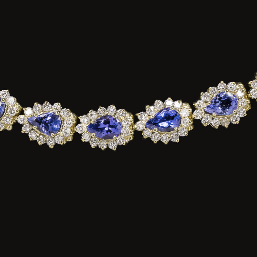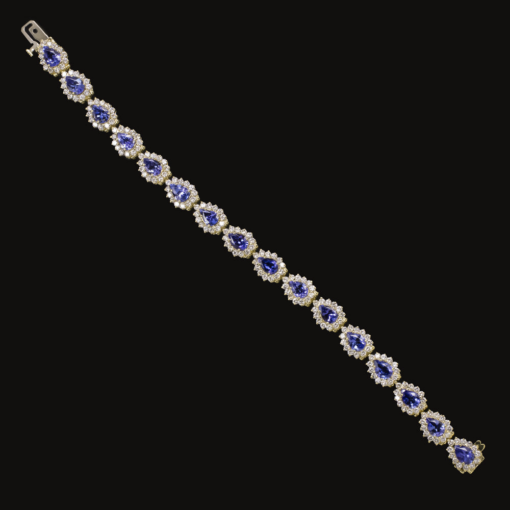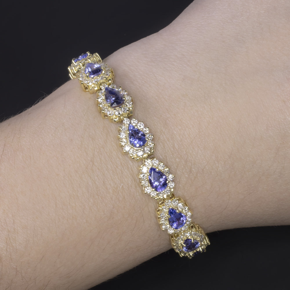 TANZANITE DIAMOND BRACELET 18k YELLOW GOLD PEAR SHAPE HALO 28 gram 19.5 CARAT