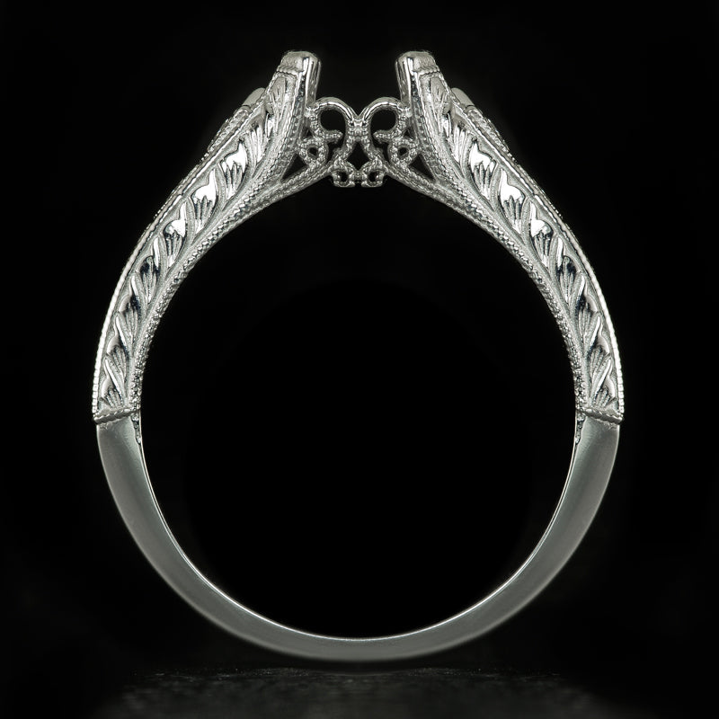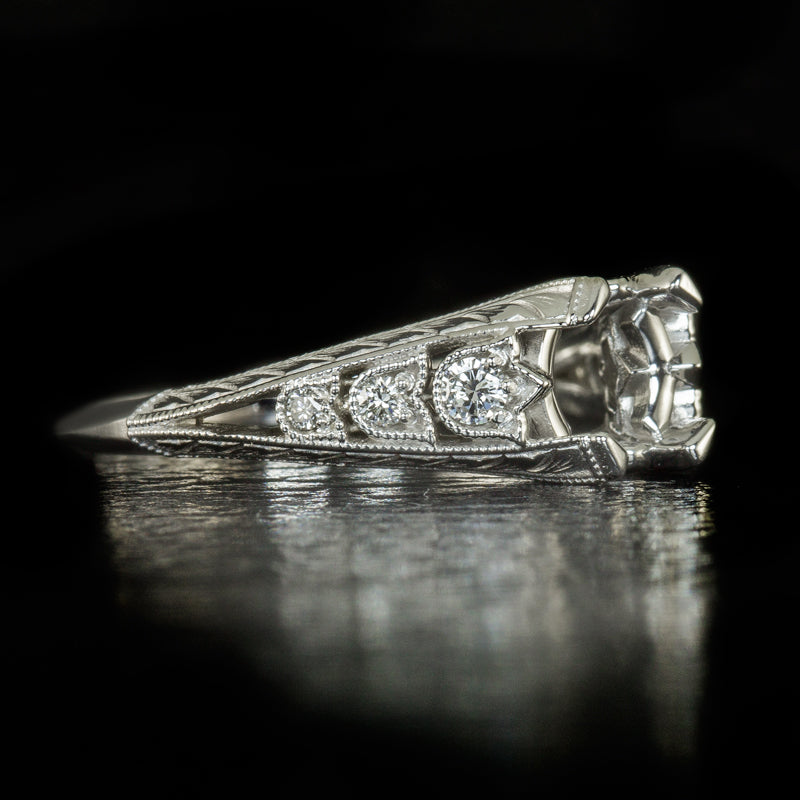 Featured here is a beautiful vintage inspired engagement ring setting with wonderful engraving and sparkling diamonds! This lovely semi-mount boasts a unique design which captures the romance and elegance of the early 1900's. It must be seen in person to fully appreciate all of its details. Made from solid 14 karat white gold, it has been finished with impressive engraved details, dotted with milgrain beading, and six sizable round brilliant cut diamonds set in the sides of the ring. The diamonds are all bright white stones which show no color, and they are all 100% clean to the naked eye with no visible inclusions. The side stones are the perfect complement to any diamond or gemstone chosen for the center. The center mounting is ideal for a round measuring 6.5mm. It can fit a round from 6.0mm to 6.8mm but can be custom modified upon request for your stone. If you are looking for a center stone, please ask us for our inventory of loose diamonds and gemstones! We are sure to have something that will complete the look of this gorgeous ring. The measurements are 6.6mm across (north-south) and 5.6mm from the finger to the top of the prongs. We are also offering this ring without the center detail in the gallery for a more open look! Please contact us if you are interested in this alternative design. This unique old world inspired semi-mount diamond engagement ring can only be found here! It will make a wonderful gift or addition to your collection!
