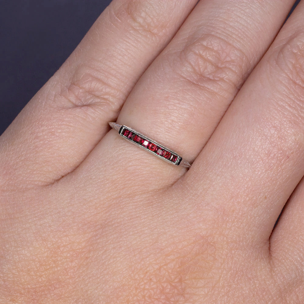 This vintage style band is beautifully crafted with romantic engraved details and a stripe of rich red rubies. It is an excellent choice for a stand alone band or wedding ring.
