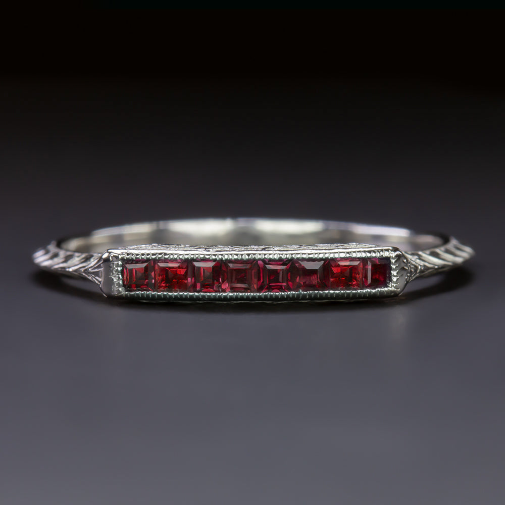 VINTAGE STYLE NATURAL RUBY WEDDING RING 14k WHITE GOLD STACKING BAND ENGRAVED