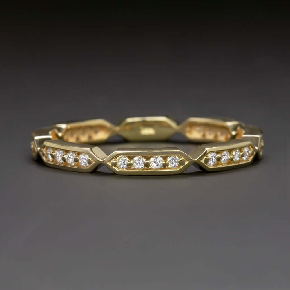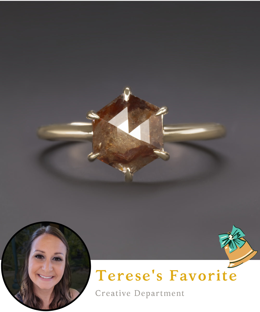 This rose cut hexagon ring is one of a kind! Unique shapes are trendy and this ring is just that. The reddish brown color of the diamond and the yellow gold setting are the perfect combo.