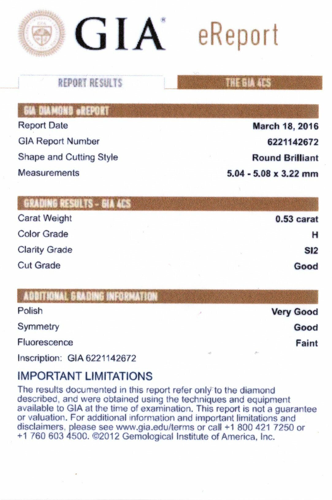 0.53ct GIA CERTIFIED H SI2 DIAMOND ROUND BRILLIANT CUT LOOSE NATURAL 1/2 CARAT