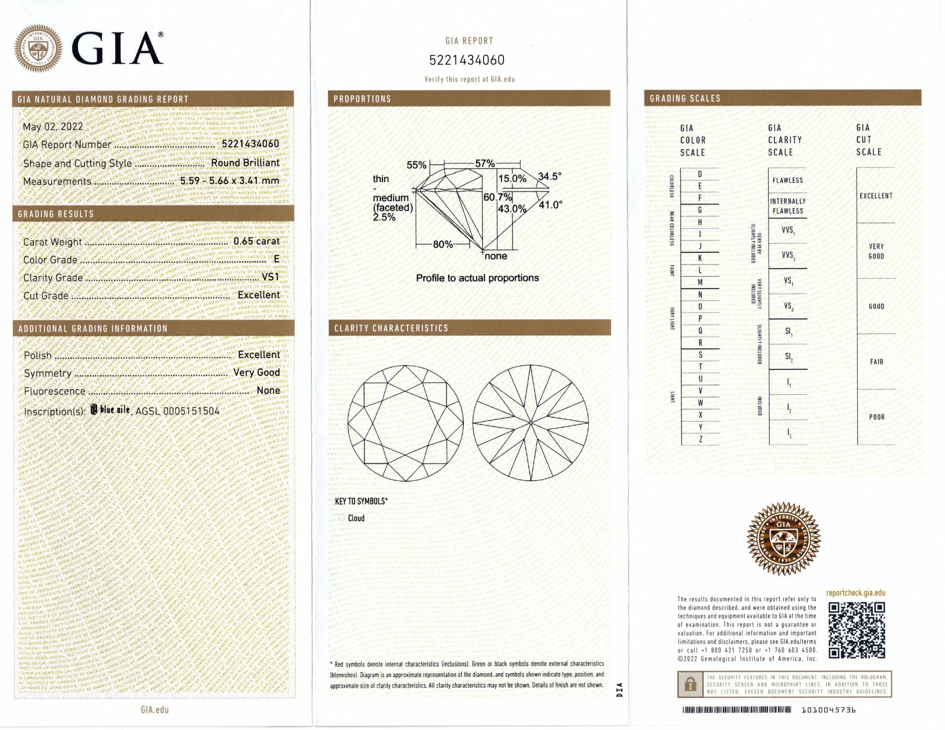 The 0.65ct round brilliant cut diamond is certified by GIA, the world’s premier gemological authority. Under GIA’s rigorous standards, the diamond received Excellent grades for Cut and Polish and a Very Good grade for Symmetry. Its sparkle is dazzlingly bright and lively with stunning and vividly colorful flashes of fire. At E VS1, it is a fantastic combination of color and clarity, as the diamond is very bright white and very clean even for the most discerning wearer. Just one subtle shade away from perfect D color, it shows absolutely no warmth. Even under 10x magnification, there are no visible inclusions. Overall, it is an absolutely exceptional quality diamond with a vibrant, eye catching sparkle!