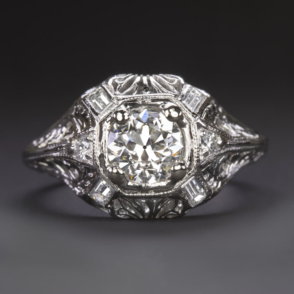 This vintage diamond engagement ring is handmade with stunning details! The platinum setting is gorgeously embellished with fine filigree and studded with baguette cut diamond accents.