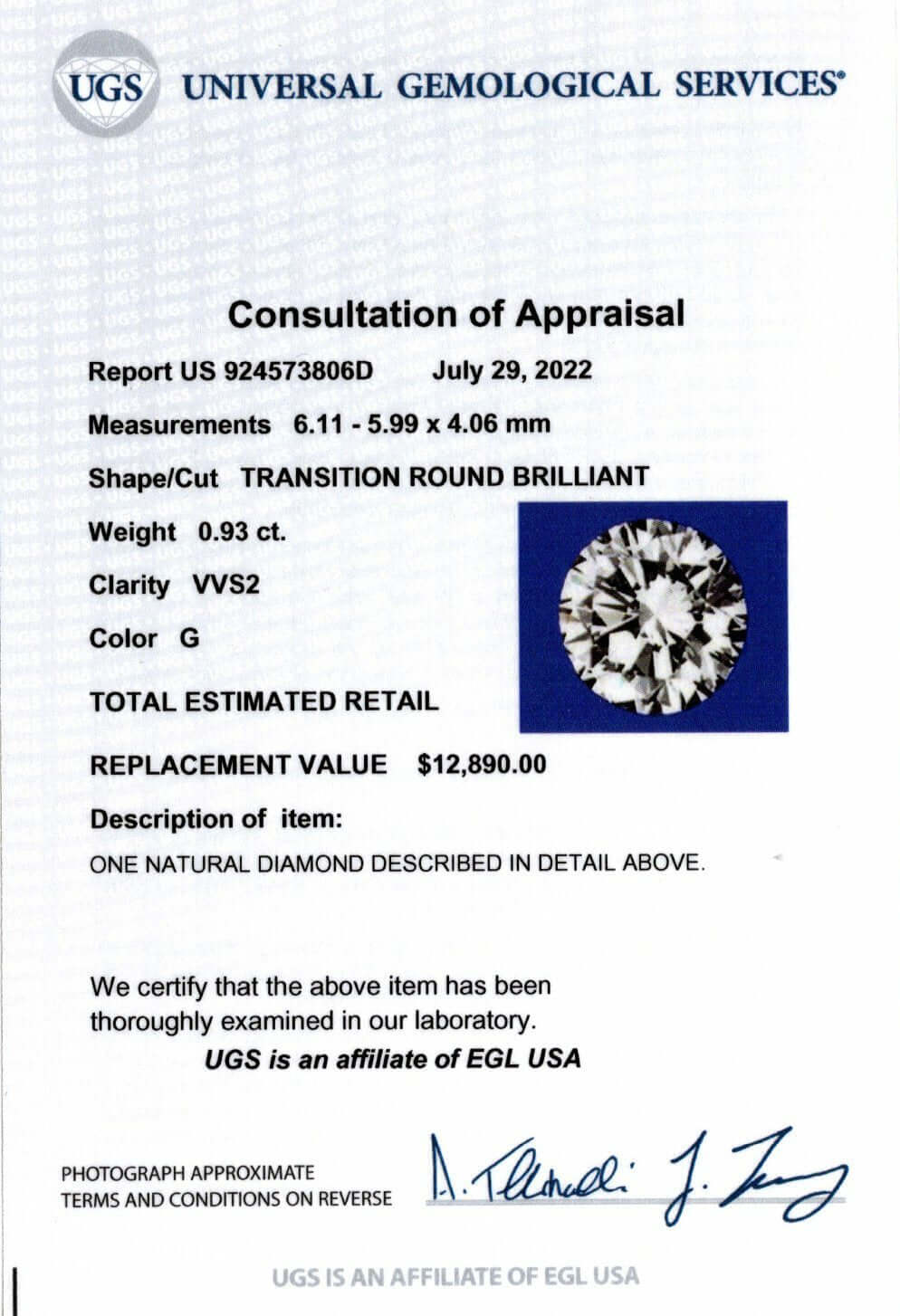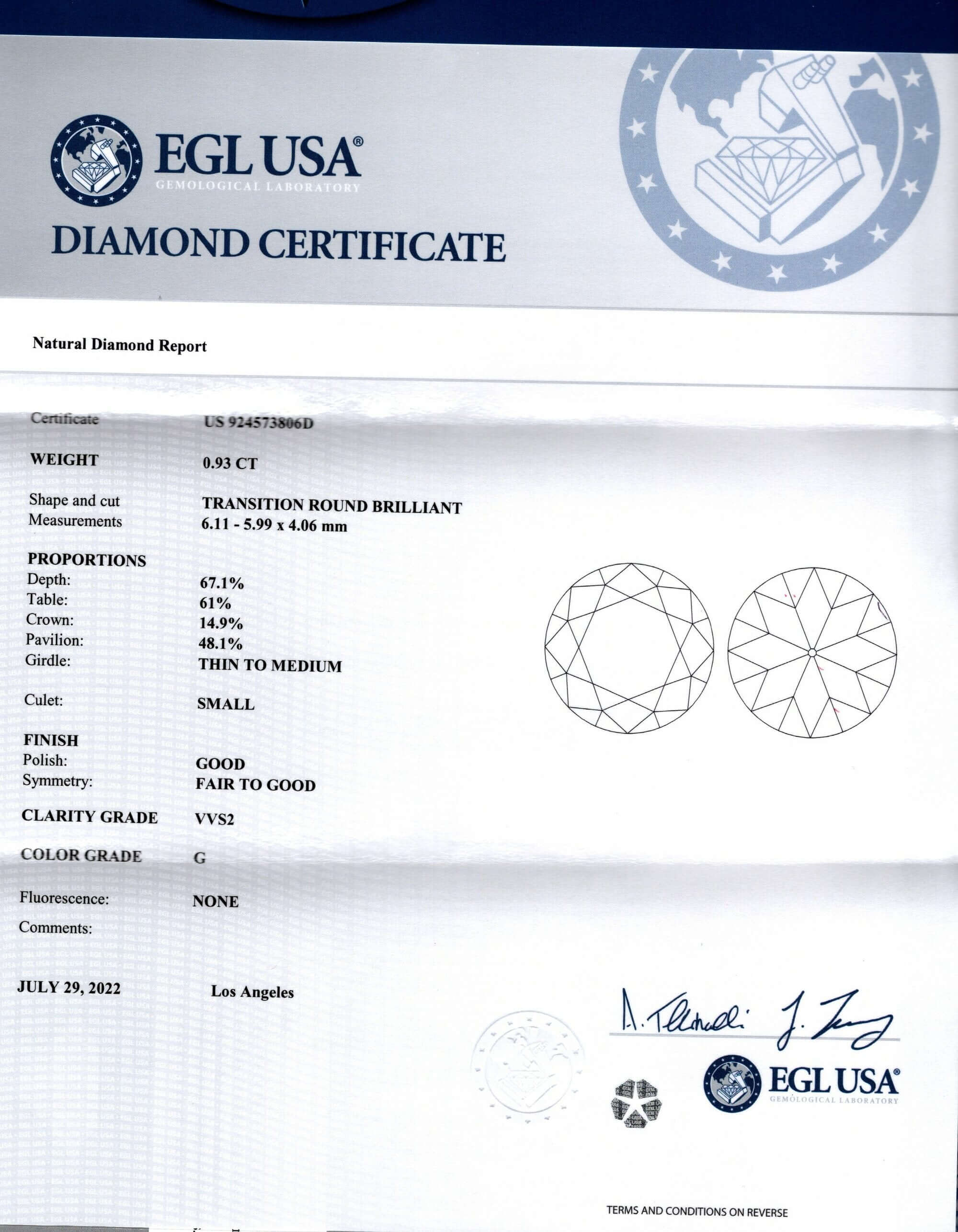 The diamond is certified by EGL-USA. Exceptionally clean, the 0.93ct diamond received a clarity grade of VVS2. The diamond is completely loupe clean; it is impossible to find any inclusions under 10x magnification. A tabletop microscope is needed to see the tiniest possible inclusion as this stone is near flawless! Graded G for color, it faces up beautifully white and shows absolutely no yellow. As an old transitional cut, it has old style facets similar to an old European cut but with a smaller culet. It absolutely retains the unique charm of a hand cut stone.