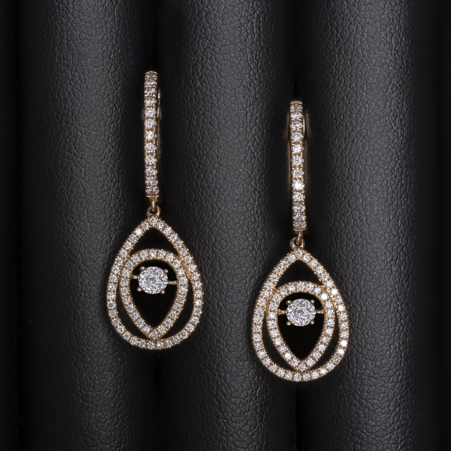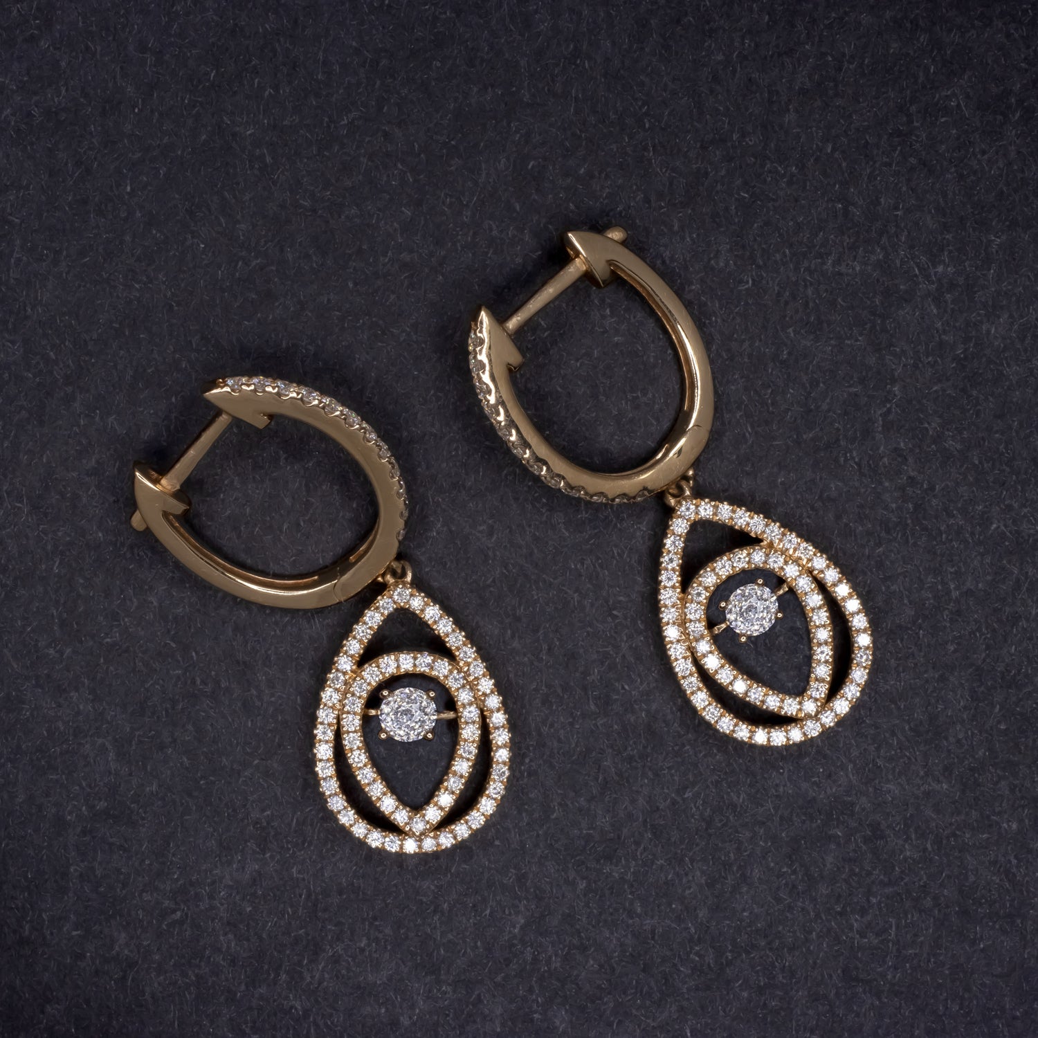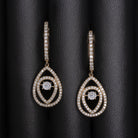 These elegant diamond earrings feature a gorgeous pair of crown of light cut diamonds inscribed within diamond encrusted teardrop dangles. The central setting is crafted with movement, so the diamonds have extra twinkle!