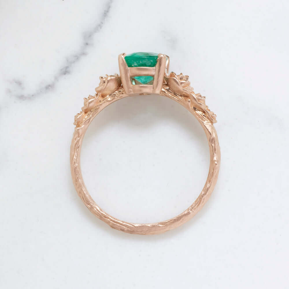 Artfully designed and absolutely unique, this stunning ring combines rustic elegance with a sweetly feminine and beautifully modern organic design. Featuring a lively green natural emerald, the botanical setting is beautifully crafted in 14k rose gold. The ring’s shoulders are adorned with intricately rendered roses, and the shank has a charming, organic branch texture. The effect is stylish, unique, and positively romantic! A fully original piece, this ring was designed and crafted in our own Chicago shop.