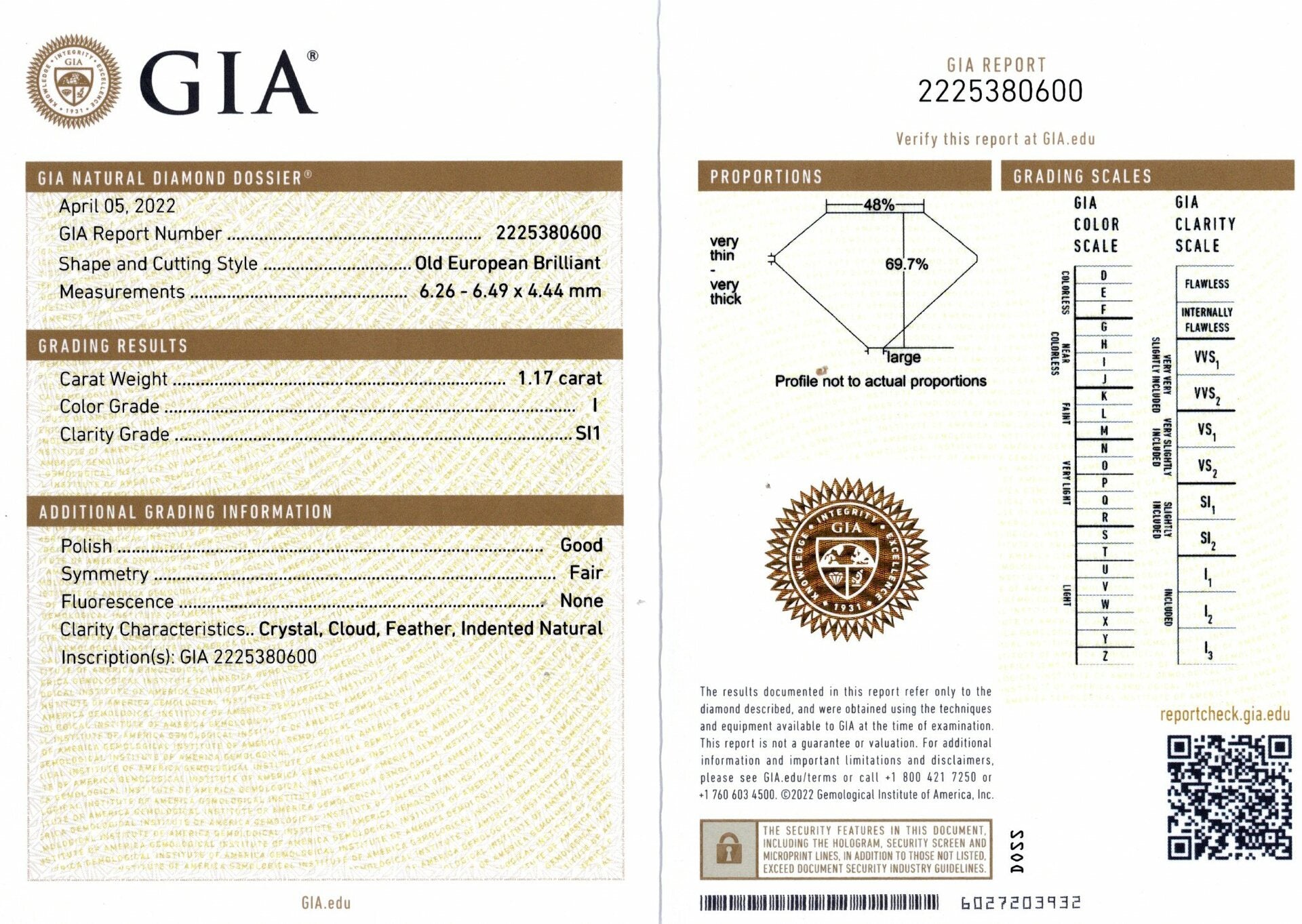 1.17ct OLD EUROPEAN CUT DIAMOND GIA CERTIFIED I SI1 VINTAGE LOOSE NATURAL ESTATE