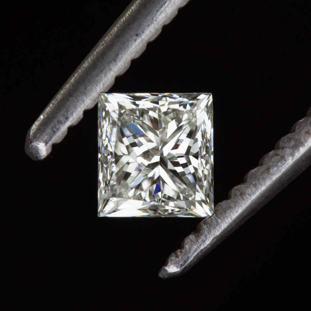 This 0.49ct princess cut diamond is beautifully white, eye clean, and displays lively brilliance! Graded I for color, the diamond faces up beautifully white. For clarity the diamond is graded SI1-SI2, and it is eye clean. The minor inclusions hide perfectly in the sparkle. The diamond’s princess cut is gorgeously lively and creates mesmerizing, eye catching sparkle!