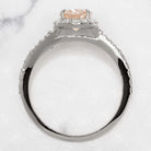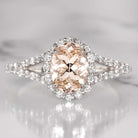 This chic morganite and diamond ring features a 1.2ct oval cut natural peach morganite surrounded by a sparkling halo of vibrant, bright white and very well cut natural diamonds. This stunning beauty is made in the USA, designed and crafted in our Chicago shop! The morganite is a beautiful blush color reminiscent of rosé, and its stylish oval cut displays gorgeous sparkle. The 14k white gold setting perfectly complements the peach center stone making the rosey color of the morganite pop! The slender yet sturdy split shank band shimmers with pave set diamonds for a fresh and flattering feminine look. The diamonds are all very well cut, so they sparkle with remarkable, vibrant brilliance. Full of bright sparkle with elegantly feminine color, this stunning ring is an excellent choice for an engagement or right hand ring!