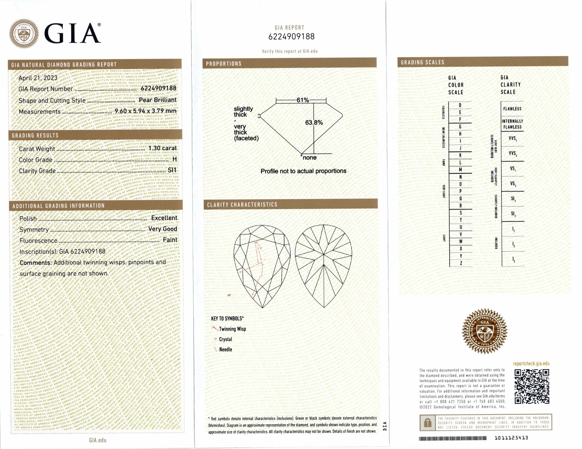 1.30ct PEAR SHAPE DIAMOND GIA CERTIFIED H SI1 LOOSE NATURAL TEARDROP ENGAGEMENT