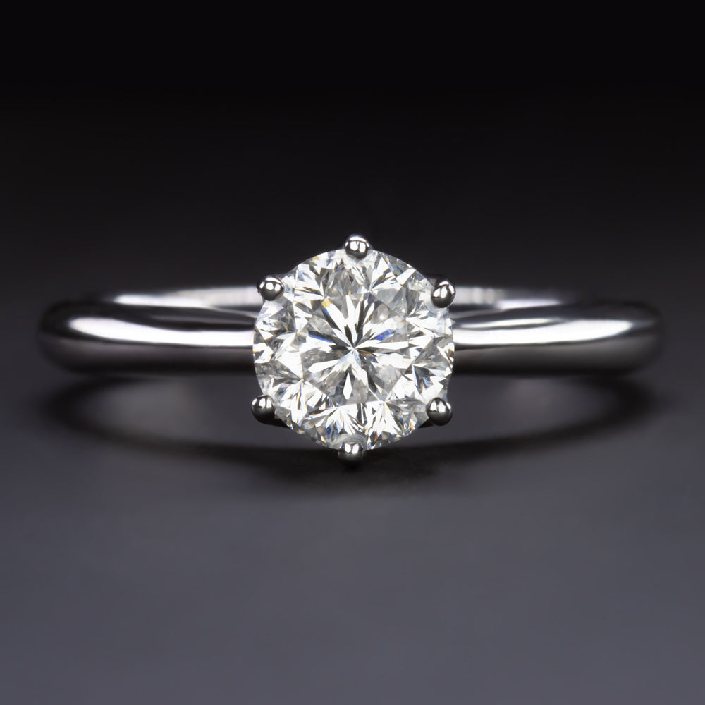 The diamond is certified by GSI, Gemological Science International. The diamond is graded H for color. The diamond faces up bright white and shows no color. Graded SI2 for clarity, it is 100% eye clean. The inclusions hide perfectly in the sparkle and are invisible to the naked eye. The diamond is 100% natural earth mined; it has not received any treatments or enhancements. Overall, it has a bright and lively look! The setting is made of solid 14k white gold. The ring measures 7.6mm across (north south) and 7.2mm from finger to top.