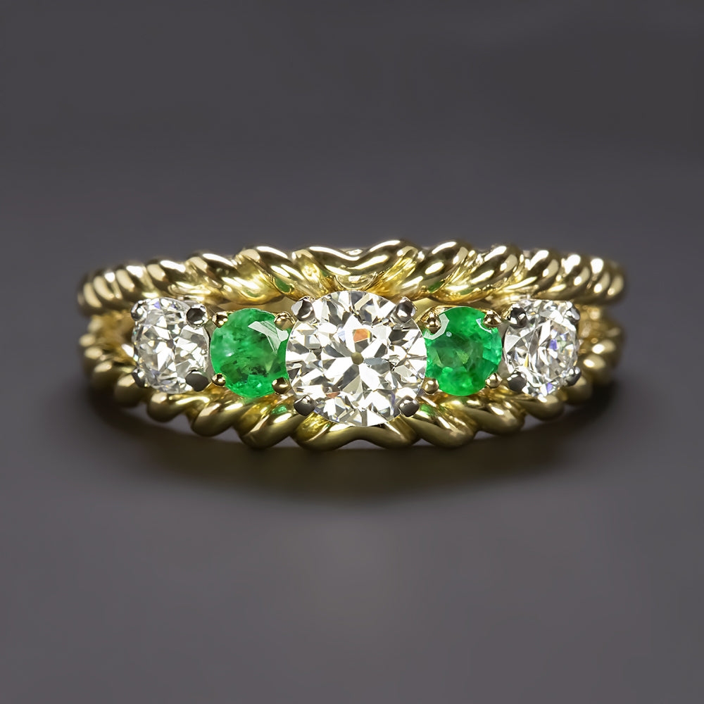 This vintage diamond and emerald ring features vibrant old European cut diamonds interspersed with spring green emeralds and bordered by twists of 18k yellow gold!