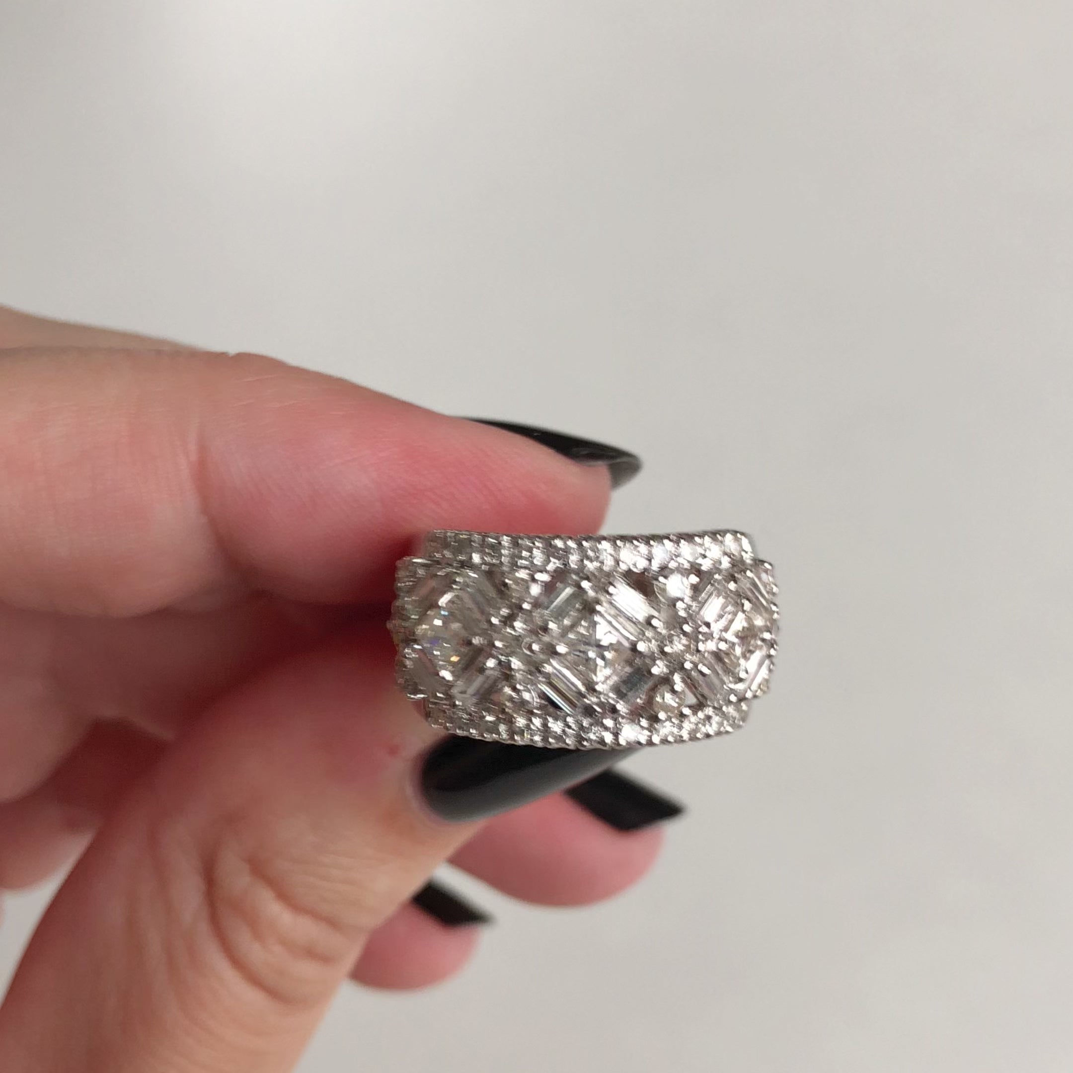 Richly designed and glittering with 1.5 carat of vibrant diamonds, this elegant cocktail ring is full of glamorous sparkle! The face of the ring is encrusted with princess, round, and baguette diamonds, creating a dynamic geometric pattern. Beautifully rendered in platinum, the ring is satisfyingly substantial at 11.4 grams. The wide shank has a luxurious feel on the finger. Overall, it is a gorgeous luxury piece that will add a touch of glamour to your wardrobe.