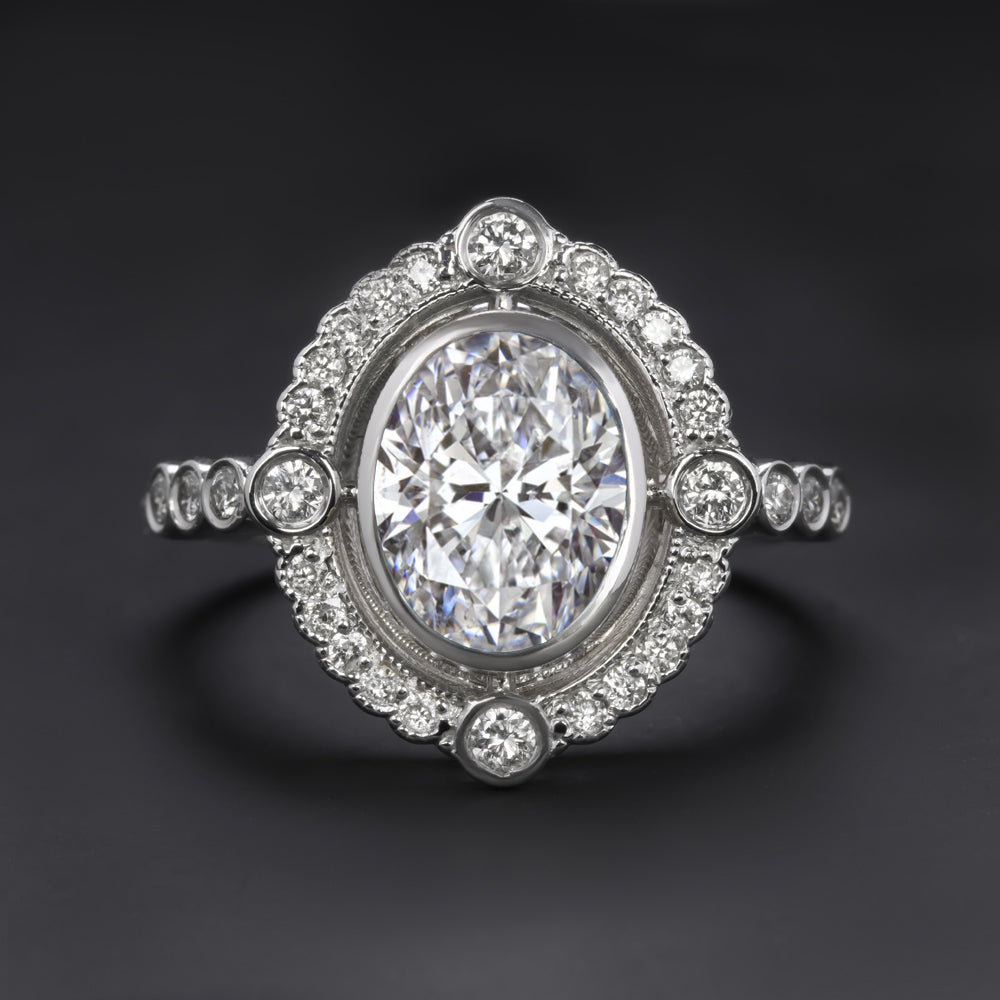 This vintage inspired diamond ring features a large 1.51ct oval shape diamond surrounded by a vibrant scalloped diamond halo!