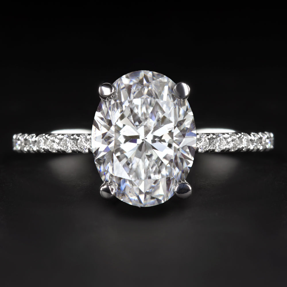 This stunning engagement ring displays fantastic sparkle with an impressive 1.51 carat oval cut diamond center and a diamond encrusted shank!
