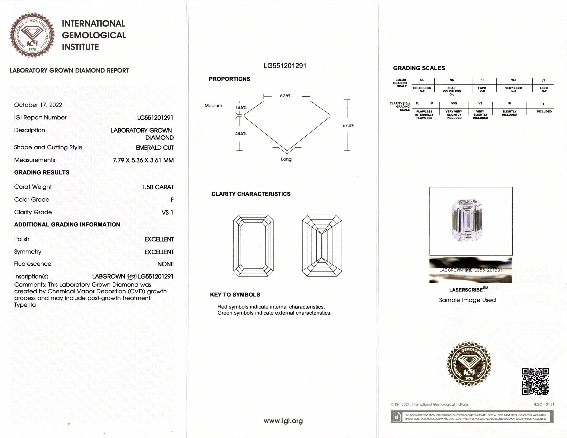 **This ring is made to order with our current offering for 1.5 carat emerald cut lab grown diamonds. This listing reflects minimum guaranteed quality. The stone you receive will be the listed quality or better on all stats (carat weight, color, clarity, cut). Please contact us if you would like to see a certification for our current selection.