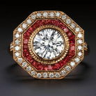This chic Art Deco style ring features a 1.5 carat diamond surrounded by a glamorous octagonal double halo of vibrant diamonds and rich red rubies.