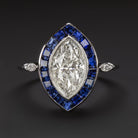 Full of Art Deco glamour and perfectly complementary color, this vintage inspired diamond and sapphire ring is elegantly sophisticated! A royal blue halo of natural sapphires provides a rich contrast to the substantial 1.52ct marquise diamond center. Inspired by the glamour and romance of the Art Deco era, this artfully crafted ring is iconic in design and lush in color. It is an excellent choice for a stylish and sophisticated engagement or right hand ring.