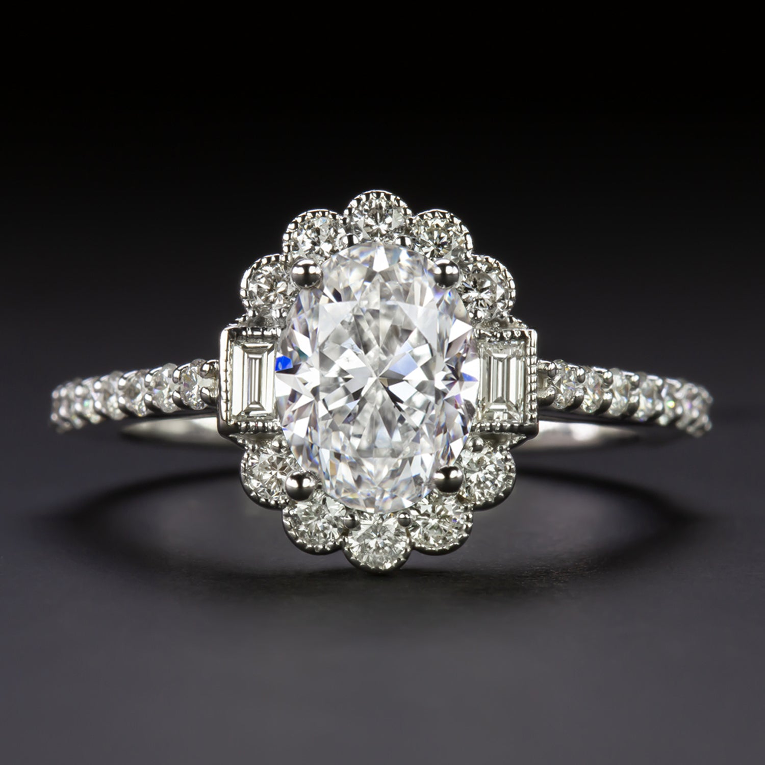 This diamond engagement ring features a gorgeous and substantial 1.20ct diamond flanked by baguette cut diamonds and surrounded by a glittering diamond halo! It is an excellent choice for an engagement or cocktail ring.