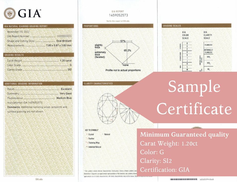 This listing reflects minimum guaranteed quality for the center diamond. The stone you receive will be the listed quality or better on all stats (carat weight, color, clarity, cut). Please contact us if you would like to see a certification for our current selection.
