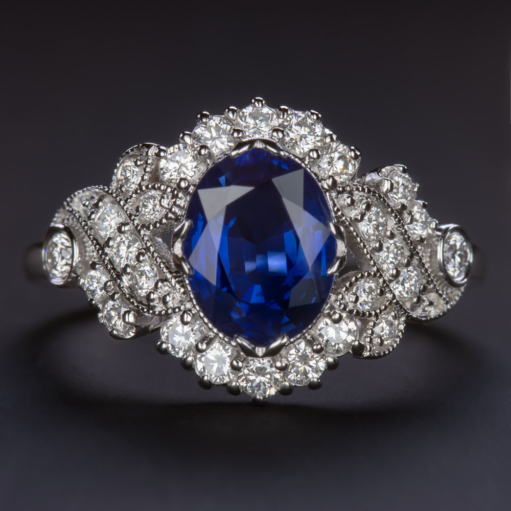 This stunning sapphire and diamond ring has an eye catching look with bright sparkle, gorgeous color, and a glamorous vintage inspired design! The 1.79ct natural sapphire is a beautiful royal blue hue that contrasts beautifully with the bright white, vibrant diamonds. The color is phenomenal, not too light or too deep, and the sapphire has fantastic luster. The elegant, diamond encrusted setting has a luxurious look and a head turning air of old Hollywood glamour. Bold, yet elegantly feminine, this beauty is an excellent choice for a stand out right hand ring or an alternative engagement ring!