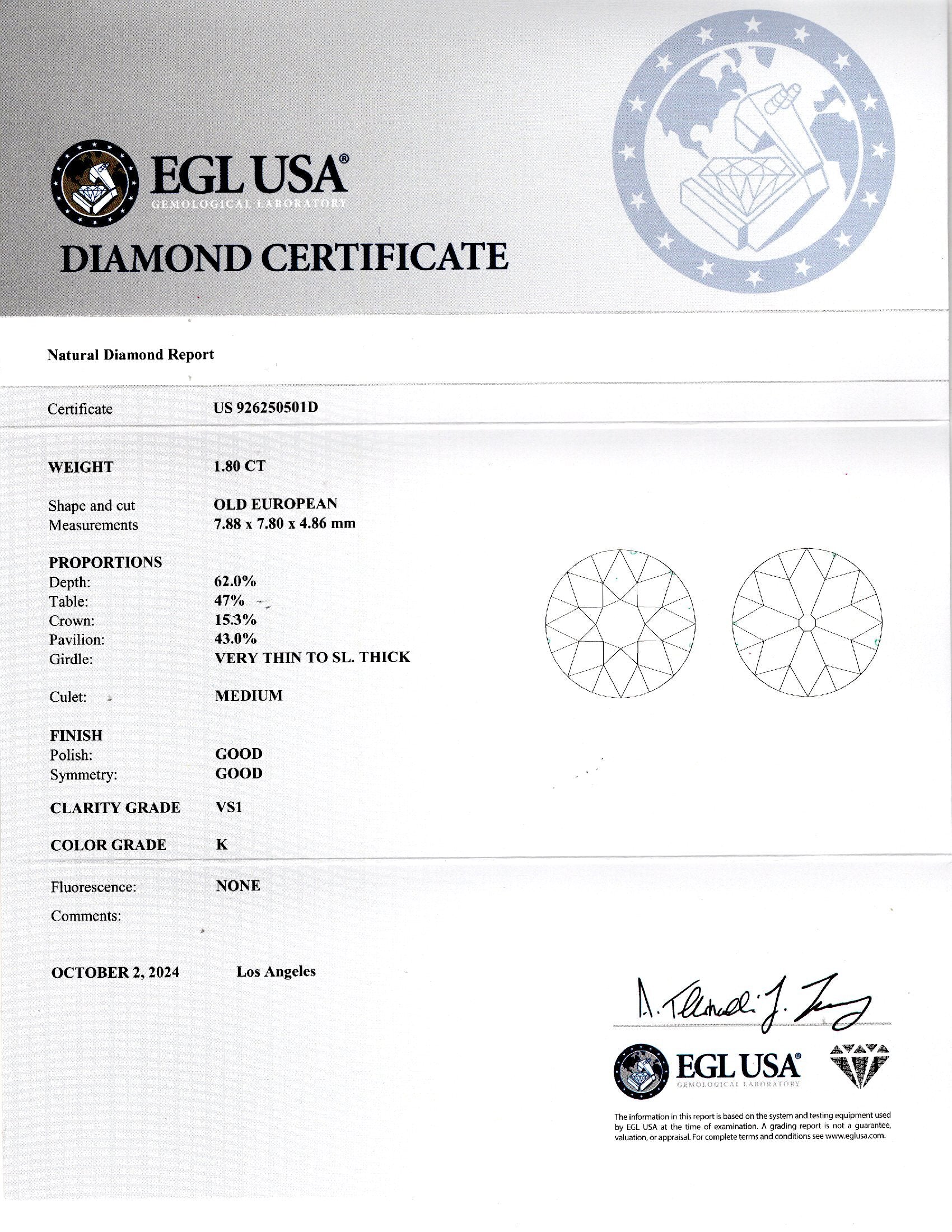 1.80ct OLD EUROPEAN CUT DIAMOND CERTIFIED K VS1 LOOSE NATURAL VINTAGE ESTATE