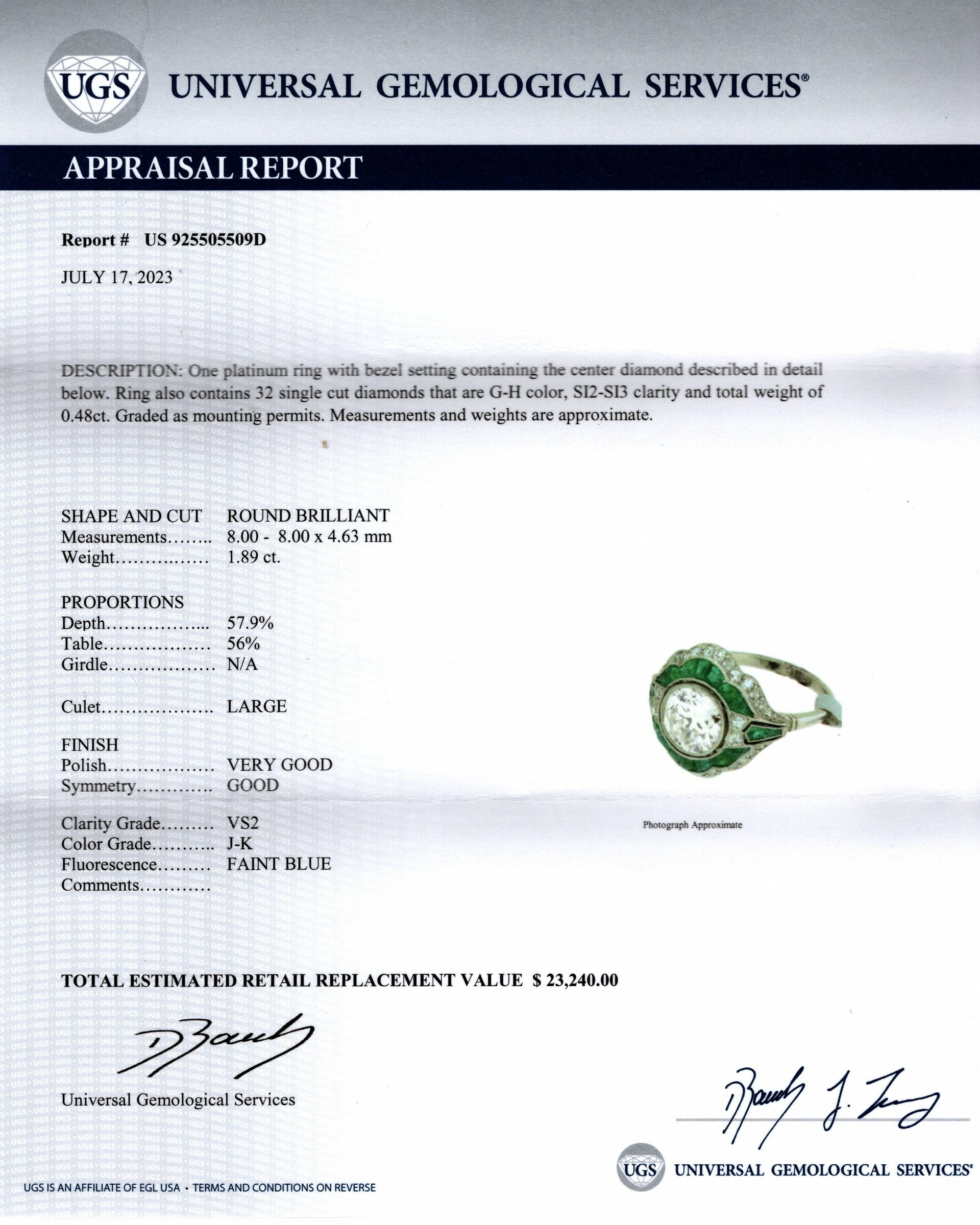 1.89ct DIAMOND EMERALD VINTAGE STYLE COCKTAIL RING OLD CUT PLATINUM CERTIFIED