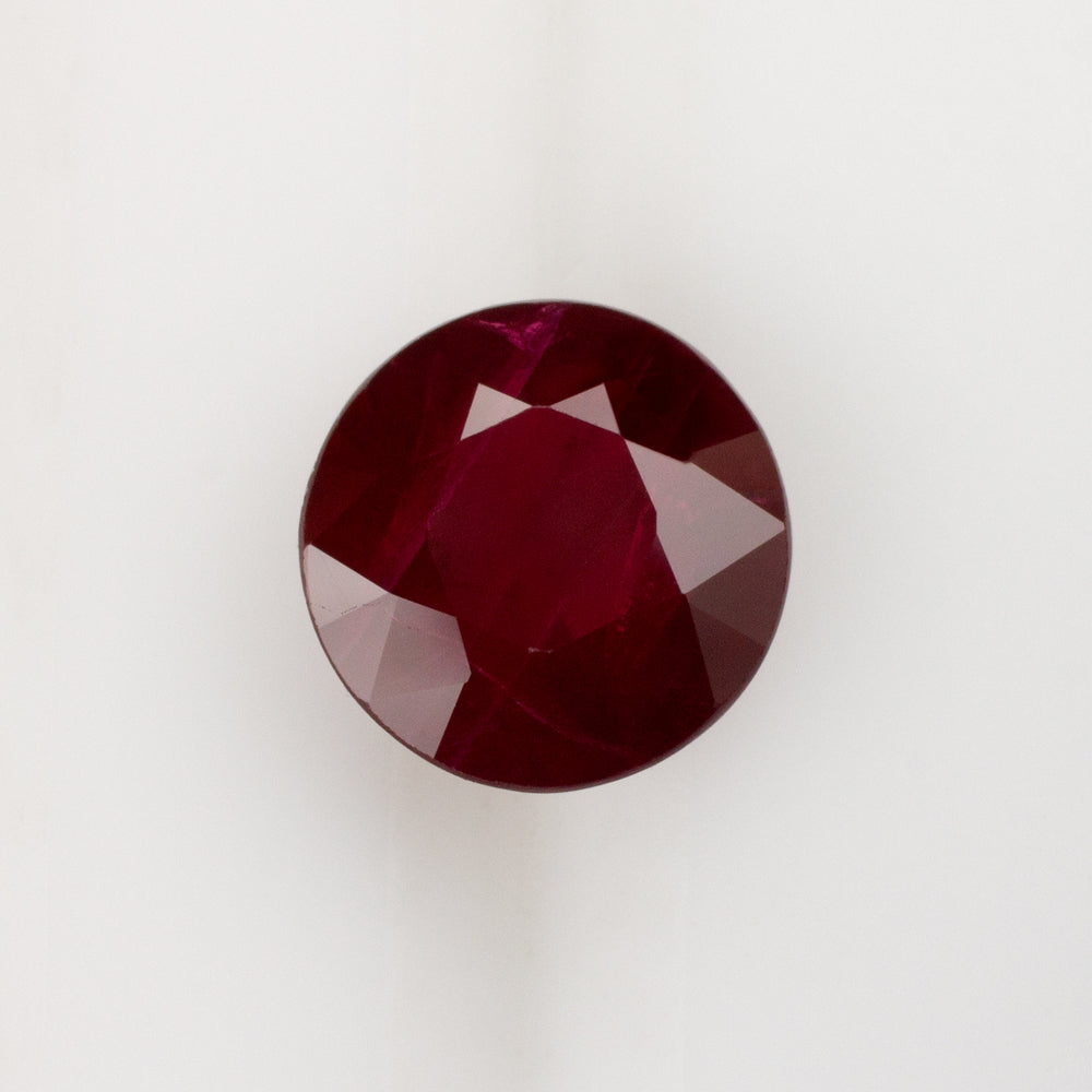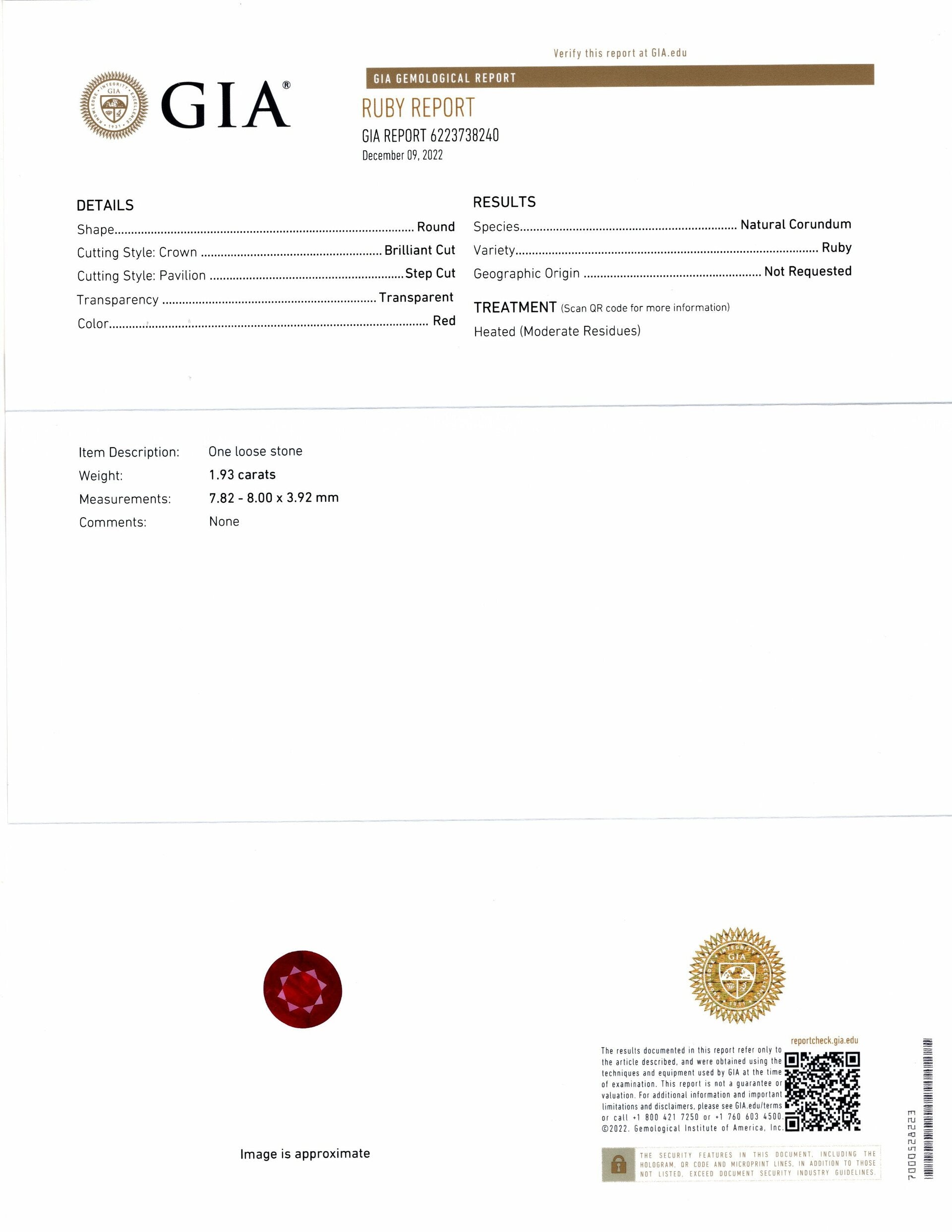 This gorgeous 1.93ct round cut ruby displays rich red color and is certified by GIA! It is quite rare to find a round cut ruby at this large 8mm size. Rounds are among the most desirable ruby cuts but are very rare because they yield the lowest carat weight from the rough. The color is a vibrant true red hue. The color is an excellent balance, very rich and saturated, and not overly deep. The ruby is classified by GIA as transparent, and it displays beautiful luster and brilliance. The ruby is natural and earth mined. It is not glass filled (also known as composite rubies) like the majority of cheap rubies flooding the market. This stone is pure ruby, unlike the composites which are a mixture which includes very low quality ruby material. The ruby has been heated by international standards, as have the vast majority of rubies. This is a routine and standard treatment for rubies, and it is completely stable and permanent.