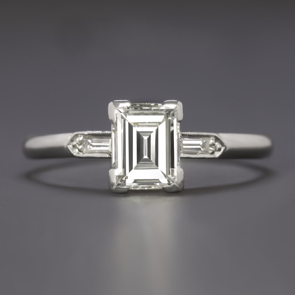 This original vintage engagement ring features a 1 carat emerald cut diamond in an utterly classic platinum setting with tapered baguette diamond accents. It is a high quality ring with a sophisticated design that will stand the test of time!