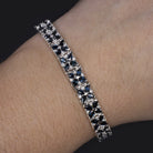 The sapphires total a substantial 10 carats. The sapphires are rich in color with a richly saturated blue hue. The diamonds total 1 carat and add substantial sparkle. Graded G-H VS2-SI2, the diamonds are bright white and completely eye clean. The diamonds and sapphires are all natural earth mined. The settings are made of solid 14k white gold. The piece weighs a substantial 12.3 grams and feels luxurious and solid. The bracelet is 7 inches long, 7.6mm across, and 3.5mm deep.
