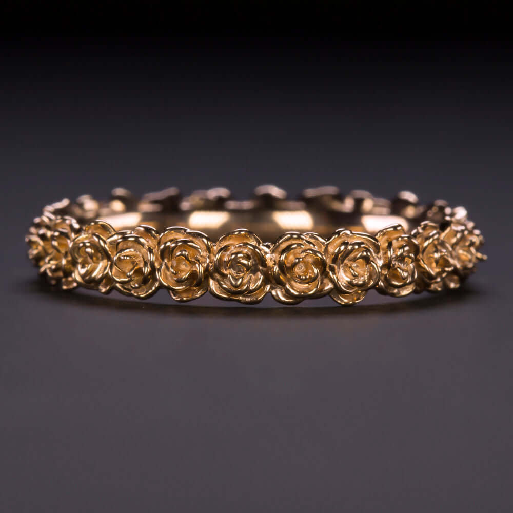 This beautiful and unique botanical stacking band features roses intricately rendered in 14k rose gold. Inspired by the boundless and surprising beauty of the natural world, these romantic beauties are gorgeous on their own or in a stack! The blushing warm of the rose gold is a pretty and apropos tribute to the flowers themselves. The ring is rendered in solid 14k rose gold, and the design continues all the way around the band. With its dreamy air of fairytale romance, this band would make an excellent wedding ring! This ring is made to order and requires additional handling time due to the full eternity design. Please allow 7 business days handling time.