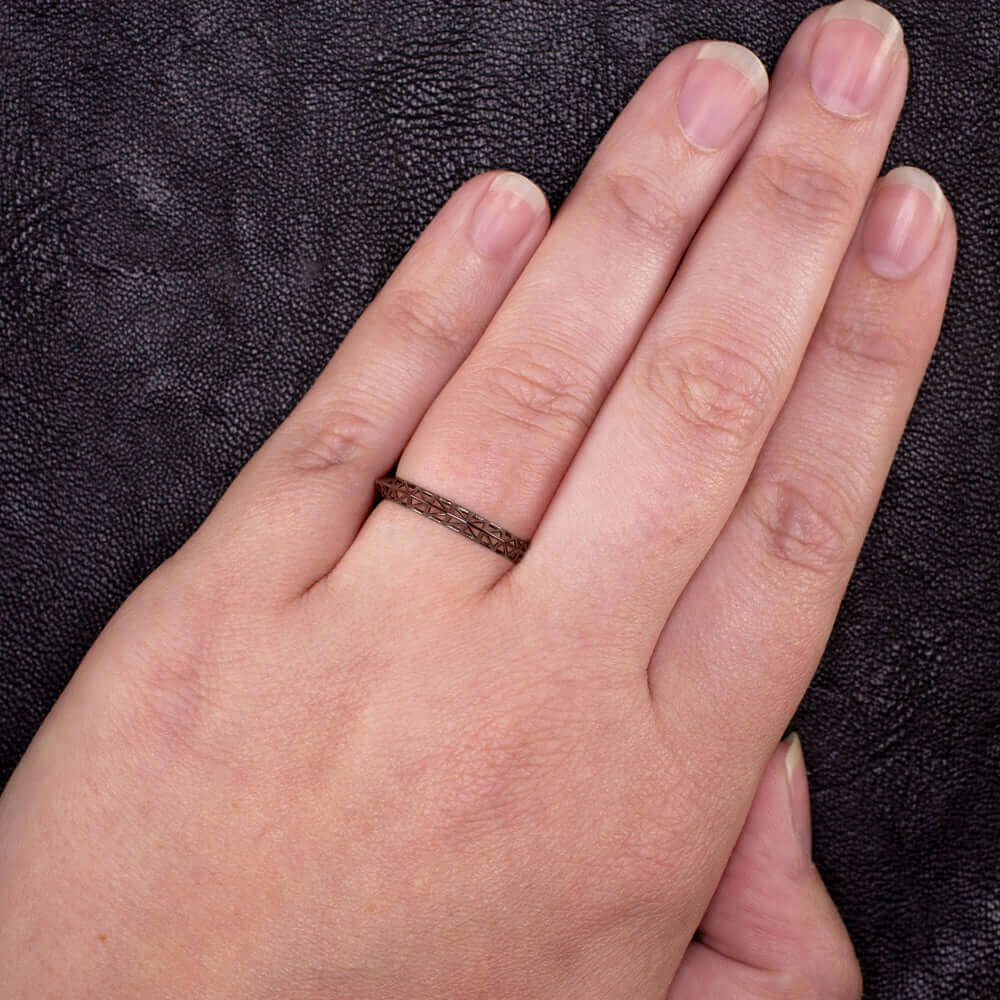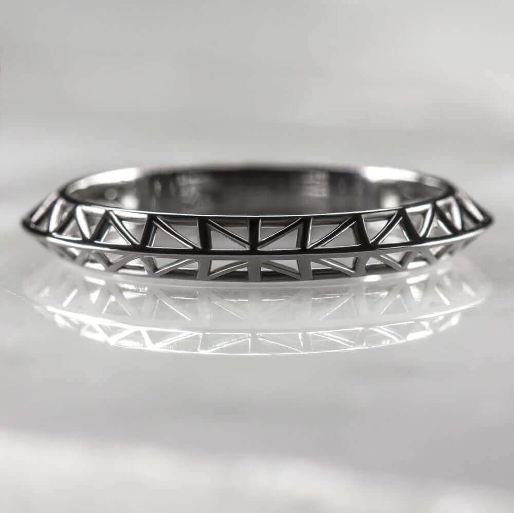 This unique 14k gold band has a look that combines modern edge with a sleek and simple design that can be stacked, worn as a wedding band, or stand on its own! Constructed with geometric filigree and finished with black rhodium, the ring manages to appear at once strong and delicate. Channeling an industrial chic aesthetic, this ring is absolutely unique with an air of modern elegance! A fully original piece, this ring was designed and crafted in our own Chicago shop. Made of solid 14k white gold, the band is finished with black rhodium. It measures 2.9mm across (north south) and 2.4mm from finger to top. With its chic, modern aesthetic and timeless profile, this ring is an excellent choice for a stacking ring, wedding band, or right hand ring!