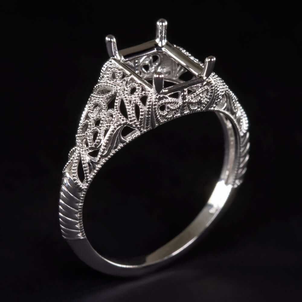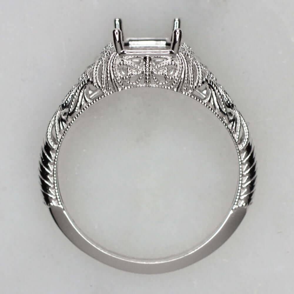 This gorgeous vintage inspired 14k white gold ring setting is elegantly designed with romantic looping filigree and richly textured engraving! The gracefully crafted metalwork truly brings to life the airy aesthetic and masterful design of the Art Nouveau era. Finished with fine milgrain details, this setting provides the perfect backdrop for a diamond or gemstone of your choice. The setting can fit an emerald, cushion, radiant, or princess cut that measures in the approximate size range of 7.2 x 5.2mm to 8.5 x 6.2mm. It can also be custom modified for any size stone of your choice. Classically fashionable, this setting is an excellent choice for a stylish engagement or right hand ring setting! We offer a large selection of loose diamonds and gemstones and would be happy to assist you in finding a center to complete this ring. Additionally, as a custom jewelry manufacturer, we do offer stone setting services to complete the finished product. We can also create a custom version for your existing center stone upon request. The ring measures 8.5mm across (north south) and 6.0mm from finger to top.