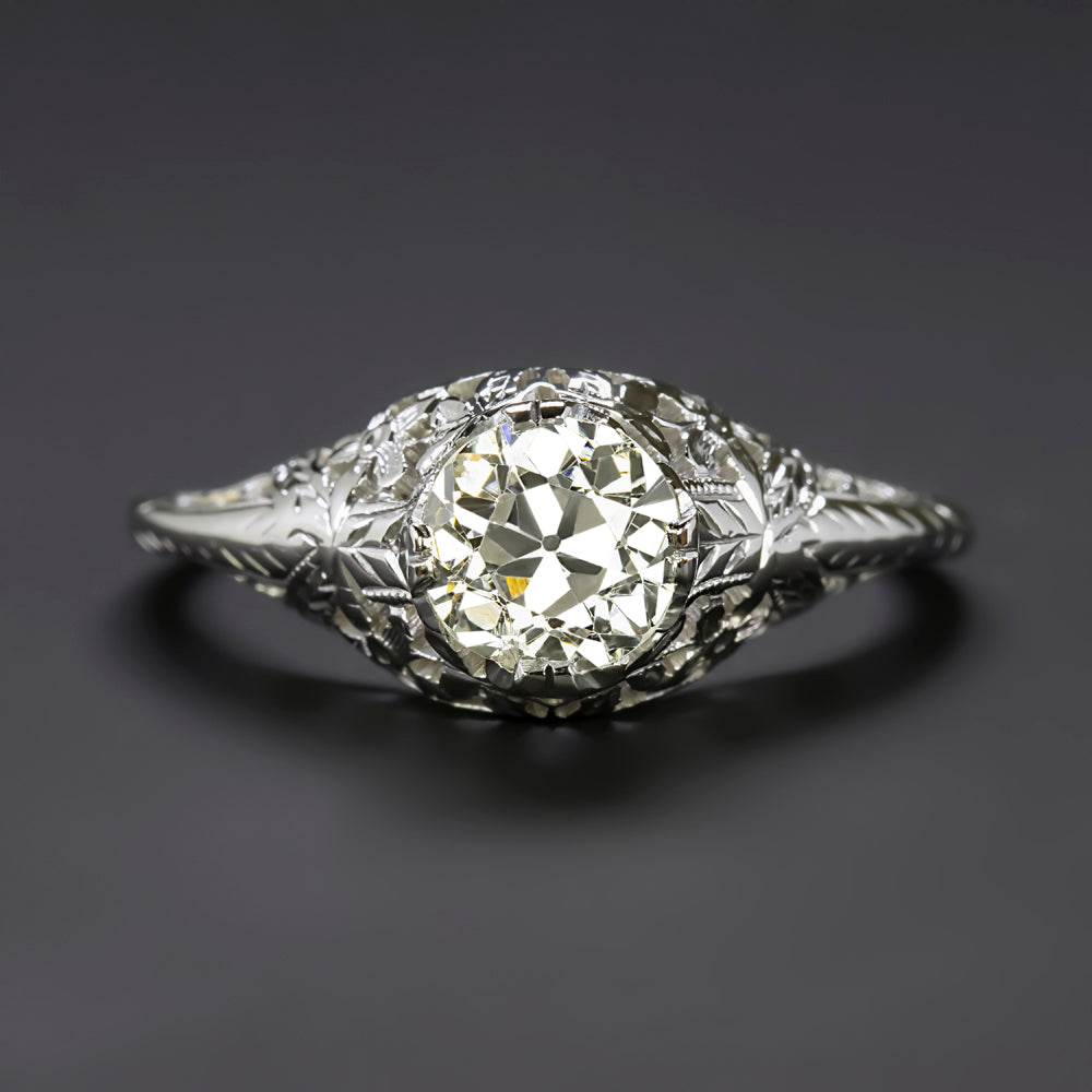 1ct ART DECO DIAMOND ENGAGEMENT RING OLD EUROPEAN CUT 18k WHITE GOLD VINTAGE