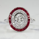 1ct D SI2 OVAL DIAMOND RUBY ENGAGEMENT RING ART DECO HALO VINTAGE TARGET 1 CARAT