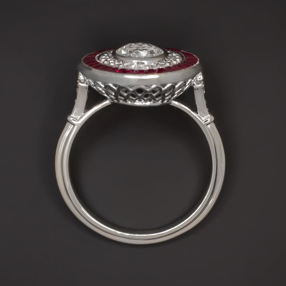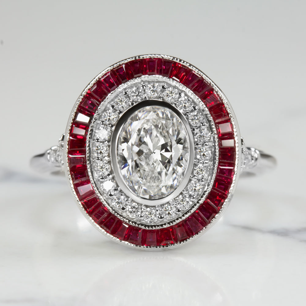This gorgeous Art Deco inspired ring boasts a 1.01ct perfectly white oval diamond surrounded by a double halo of sparkling diamonds and custom cut rich red rubies. The red of the natural rubies creates an eye-catching contrast with the bright white of the diamonds and the 14k white gold setting. The classic Art Deco target design gives the ring a feel that is both refined and glamorous.