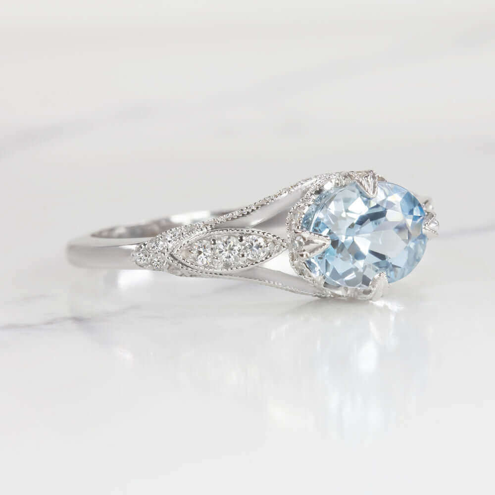 1ct NATURAL AQUAMARINE DIAMOND RING OVAL VINTAGE STYLE WHITE GOLD BLUE EAST WEST