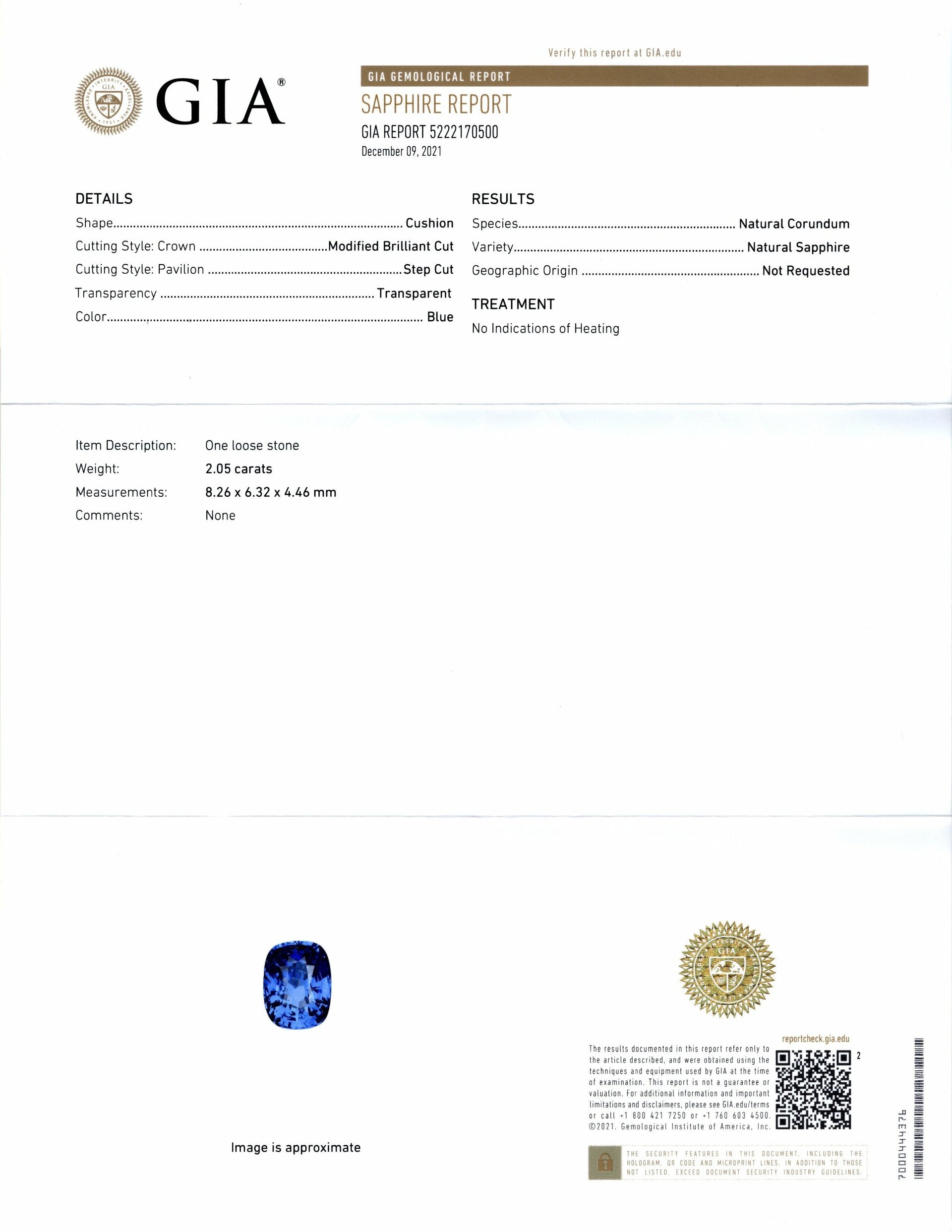2.05ct GIA CERTIFIED NO HEAT CEYLON SAPPHIRE CUSHION CUT BLUE LOOSE NATURAL 2ct