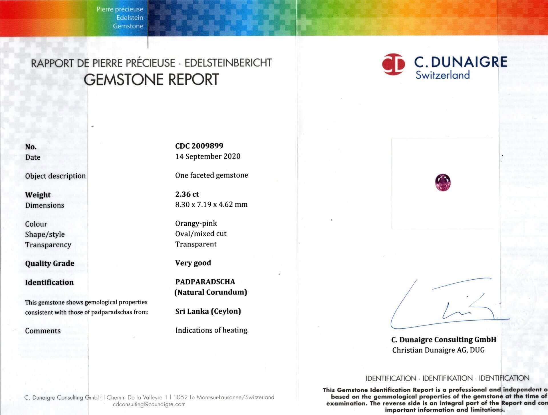 This gorgeous 2.36ct oval cut padparadscha sapphire has a beautiful bright salmon hue! The sapphire is certified by C. Dunaigre with a classification of padparadscha and a geographic origin of Sri Lanka (Ceylon). The color was classified as Orangy Pink.The color is gorgeous, vibrantly saturated, reminiscent of a sunset. The sapphire truly does have the iconic and highly sought after Padparadscha color. The sapphire was mined in Sri Lanka (Ceylon) as confirmed by the certificate. Sri Lanka is known to produce sapphires of exceptional quality and is one of the most prized origins in the world for sapphires. The sapphire is transparent, allowing light to pass through and making it particularly luminous. It has been heated, as have the vast majority of sapphires. This is standard, stable and permanent. Overall, the sapphire has a gorgeous look with rich color, lively brilliant, and its very fashionable and flattering oval shape. This beauty truly has a magnificent presence and would make a gorgeous center for an alternative engagement ring or cocktail ring.