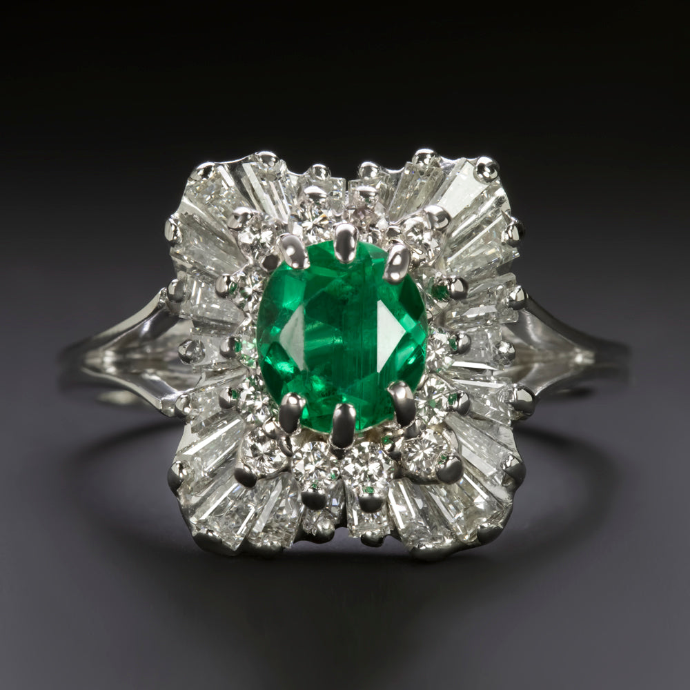 This emerald and diamond cocktail ring features a bright green emerald surrounded by a scalloped halo of round and tapered baguette diamonds.