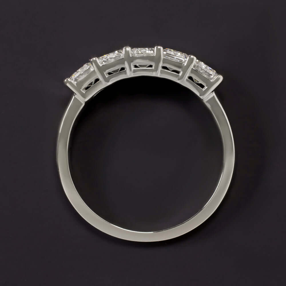 Totaling 2 carat, each of the 5 diamonds is individually quite substantial at 0.40ct each! The diamonds are all brilliantly white with color grades of F-G. They will stand out brightly against any background. Graded VS1-SI1 for clarity, the diamond are all 100% eye clean. The few inclusions are much too small to see with the naked eye. The diamonds are full of life and have a gorgeous play of light. The diamonds are all completely natural, earth-mined, without any treatments or enhancements of any kind. The solid 14k white gold band perfectly complements the diamonds’ brilliant white sparkle. The shank is satisfyingly substantial and has a luxurious feel. The ring measures 5.4mm across (north to south) and 3.6mm from finger to top. We can also customize this ring to your specifications. We can create a full eternity version or any other iteration you would prefer. Please inquire if you are interested in a variation of this ring.