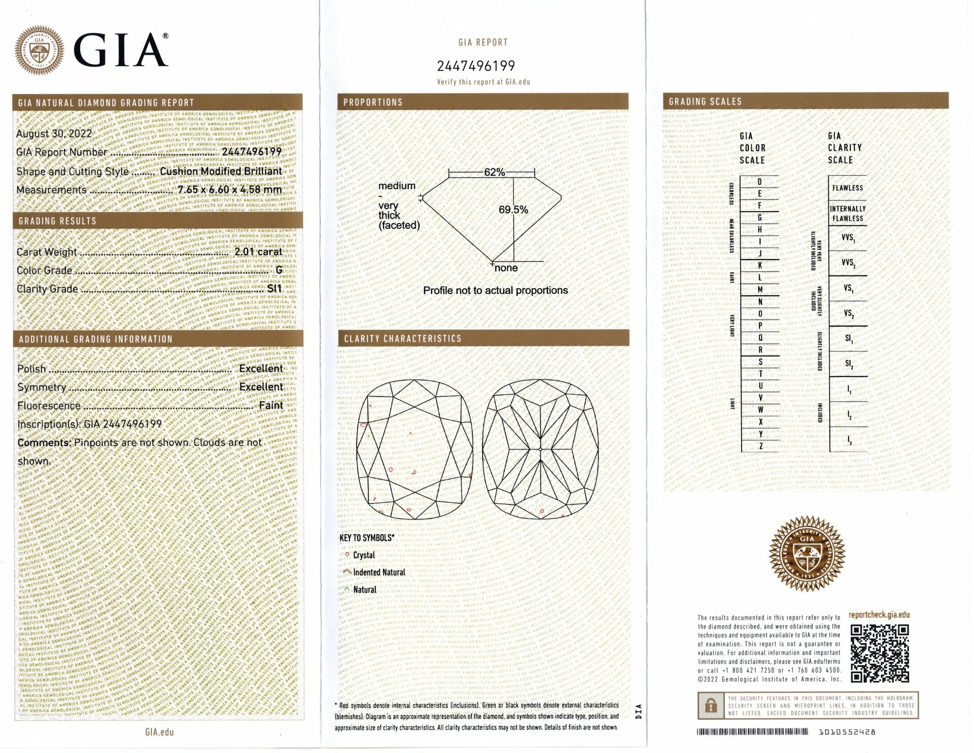 This gorgeous 2.01ct GIA certified cushion cut diamond is completely eye clean, bright white, and it sparkles stunningly with vibrant brilliance! The diamond is certified by GIA, the world’s premier gemological authority. Under GIA’s rigorous standards, the diamond received a color grade of G, and it faces up bright white with absolutely no warmth. The stone has crisp white color and does not have any brown, green or milky shades. It’s a proper G color stone! Graded SI1 for clarity, the diamond is 100% eye clean. the few inclusions are much too small to see with the naked eye. Overall, it’s a beautiful, high quality diamond with dazzling brilliance, vivid fire, and a sophisticated cut. With its exceptional cut, lively sparkle, bright white color, and excellent clarity, this diamond is a perfect choice for an engagement ring or right hand ring!