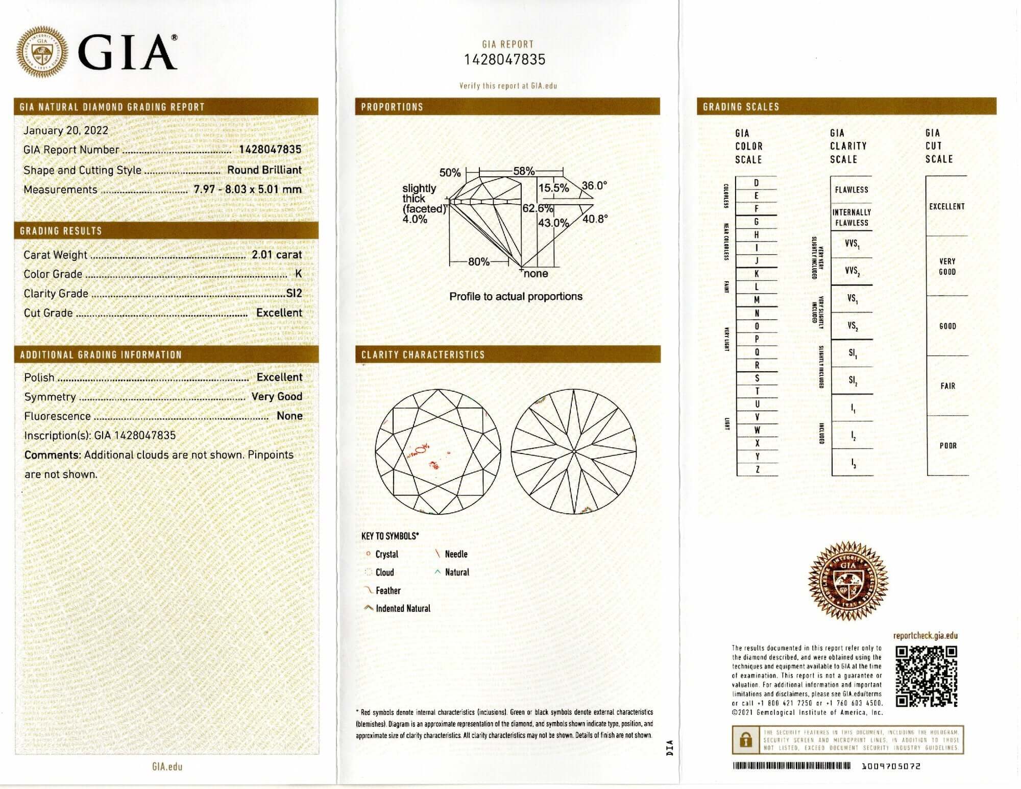 2 CARAT GIA CERTIFIED K SI2 EXCELLENT CUT DIAMOND LOOSE ROUND BRILLIANT NATURAL