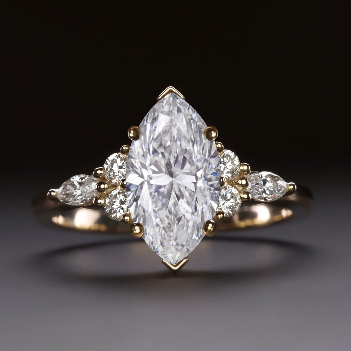 This striking engagement ring features a substantial 1.94 carat marquise cut diamond flanked by clusters of round and marquise diamonds!